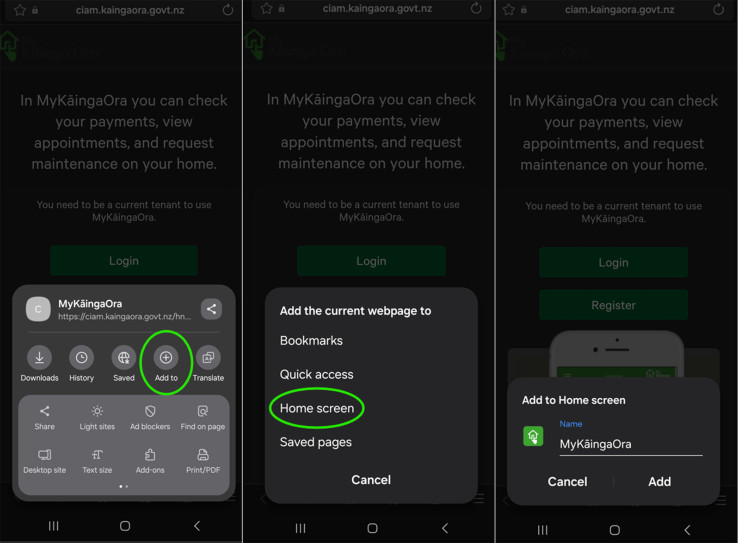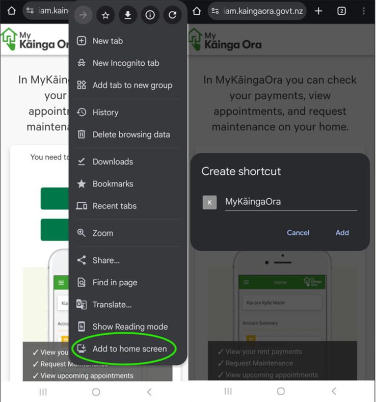 Save MyKāingaOra to your device home screen